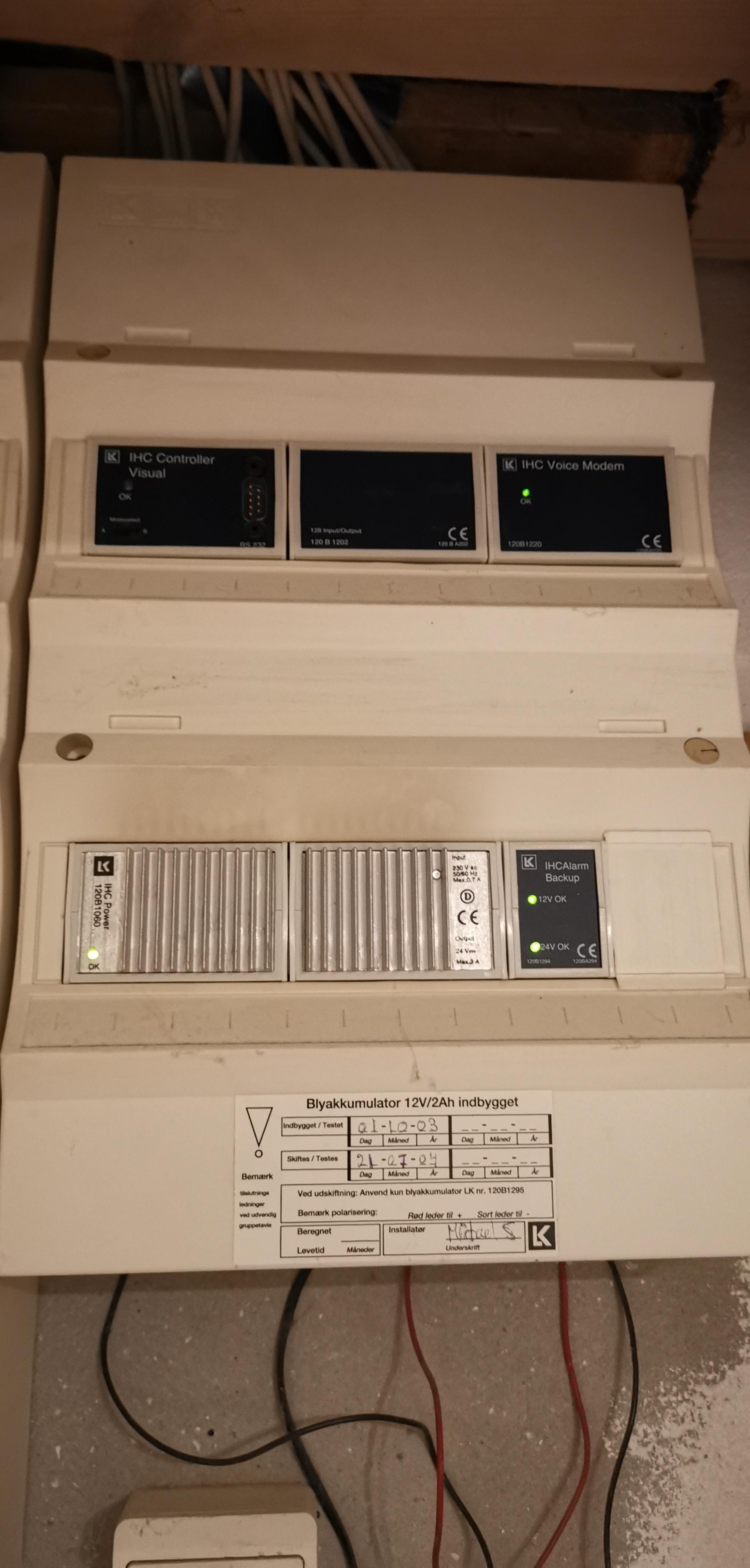 Lars1 Besvaret September 20, 2022 Rapporter Share Besvaret September 20, 2022 For det første. Dine billeder viser ikke in/output modulerne, så det er svært at sige noget om hvor stor din IHC installation er og hvad den indeholder. Dit kode tastatur er et af dem hvor koderne ligger i tastaturet og det kræver en master kode at ændre. Du kan læse mere om det her https://www.lk.dk/produkter?iid=11242 Der er også en princip tegning af hvordan IHC alarm er bygget op m.m. Master koden kan resettes hvis du får fat i et andet kode tastatur af samme model og hvor du kender masterkoden. Det nye tastatur skal sættes i serie med dit. Det er vigtigt at det nye tastatur sidder først på kæden. Hvis det sidde sidst vil dit tastatur overskrive koderne i det nye tastatur, og så har du 2 tastatur hvor du ikke kender koderne. Ved at sætte det nye tastatur først i kæden bliver koderne i dit tastatur overskrevet med de kendte koder i det nye tastatur. De 2 første moduler i tavlen er IHC controlleren. Det ser ud til at være den gamle Visual 1 controller. Den nyeste hedder Visual 3. En af fordelen ved IHC er at du kan opgrader til en Visual 3 controller ved bare at skifte selve controlleren. Alle andre moduler kan genbruges. Den nye controller kan programers før den bliver monteret, så selve nedetiden ved opgraderinge begrænser sig til selve ombytningen af controllerne samt evt. efterfølgende fejlsøgning. Det næste modul er et voice modem. Det kræver en gammeldags fastnet tlf. line for at funger. Men så kan man f.eks. tænde og slukke for lys eller varme ved at ringe til nr'et som er forbundet til installationen, og installationen kan ringe og give alarm. Meget smart og avanceret for 20 år siden og stadigvæk funktionelt hvis man ellers har en fastnet linie og ikke har opgraderet til Visual 3. Voice modem'et er kun understøttet af Visual 1 og 2 controller. Du kan læse mere om det her. https://www.lk.dk/produkter?iid=#120B1220 De næste 2 moduler er den gamle 24V strømforsyning som forsyner din IHC installation med strøm. Hvis du vælger at opgrader din IHC controller, bør du samtidig udskifte strømforsyningen da den plejre at være den første som står af i en IHC installation. Det sidste modul er et batteri backup modul, som via et batteri som ligger i bunden af tavlen forsyner de kritiske dele af din IHC installation med strøm i tilfælde af en strøm afbrydelse. Som du kan se af klistermærket i bunden af tavle er der næppe meget liv tilbage i dit batteri. Det bør helt klart skiftes hvis du vil sikre dig mod strømafbrydelser. Batteriet er normalt fastgjort med dobbelt klæbende tape til bunden af tavlen, men med en tæt på 20 år gammel installation holder det næppe længere, så pas på hvis du åbner tavlen. Batteriet kan nemt falde ud. De ledninger som hænger ud af bunden af tavlen er forbindelsen mellem batteriet og batteri backup modulet. Du kan læse mere om batteri backup modulet her. https://www.lk.dk/produkter?iid=11265 Citér Link til kommentar Del på andre sites More sharing options...