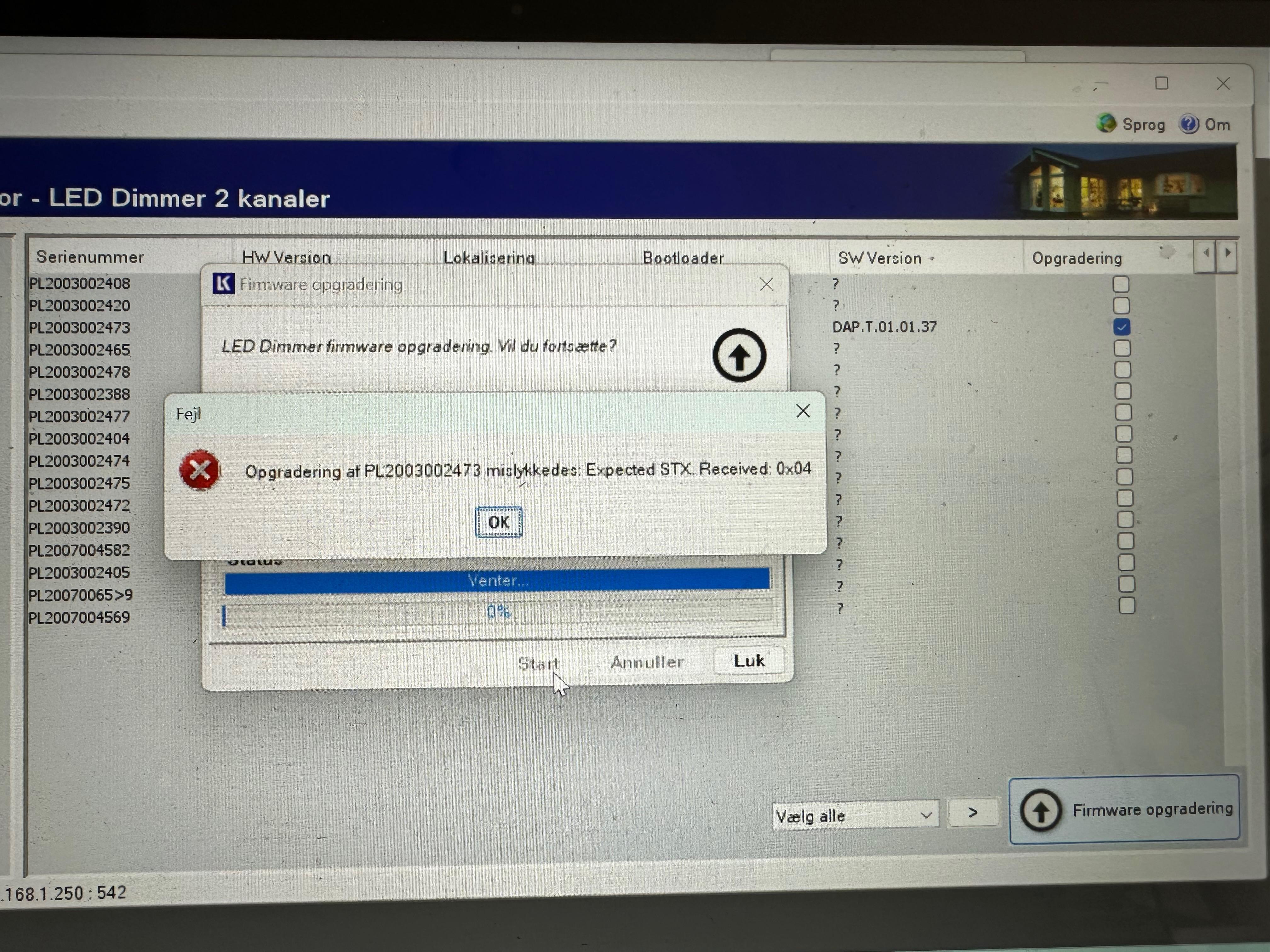 Det virker som om der enten er problemer med IHC Controlleren eller med kommunikationen mellem IHC Controller og de 17 stk. IHC Led Dimmer 2 Kanal.